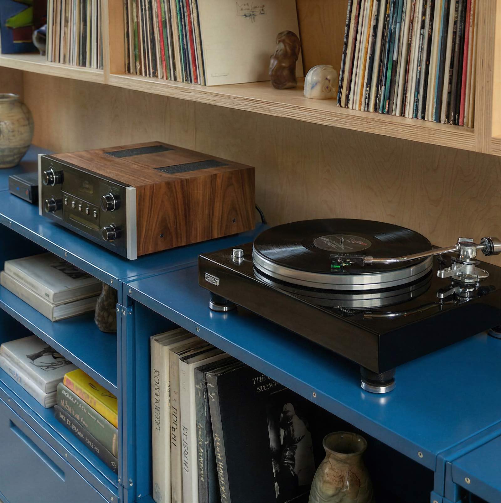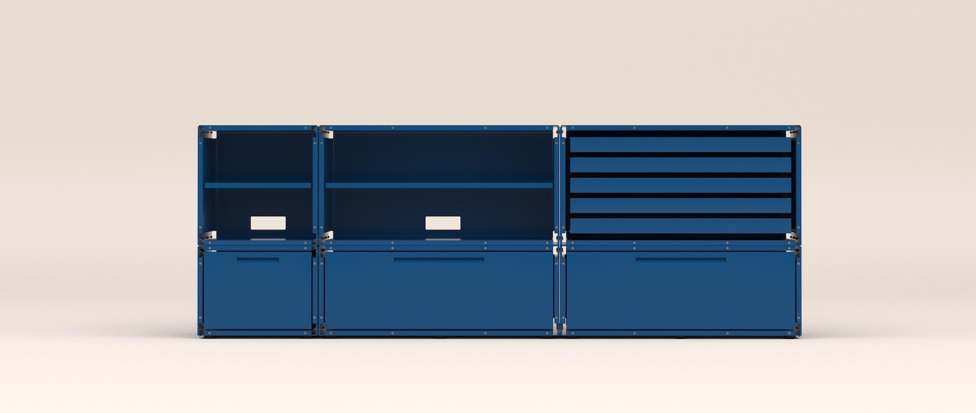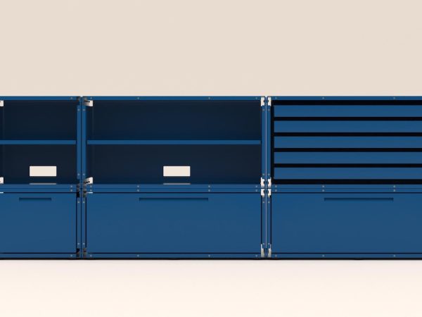 Nowoczesny, modułowy design w intensywnym odcieniu niebieskiego łączy funkcjonalność z wyrazistym, industrialnym akcentem, pasując do różnorodnych wnętrz.